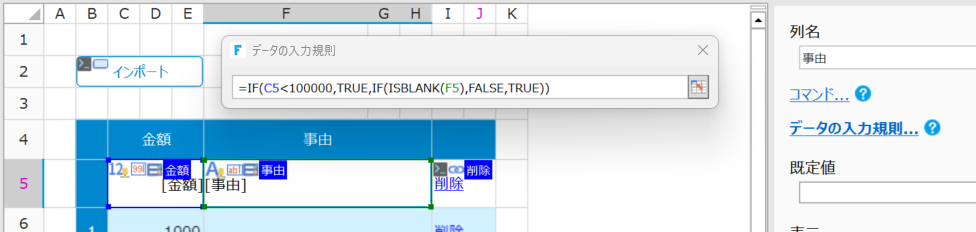 リストビューにインポートデータが設定される前に検証が行われるため、入力規則内でリストビューのテンプレート行を参照するロジックは、インポート時に正しく動作しない場合があります。例えば下記のように、入力規則の[ユーザー設定]で、「金額が100,000円を超える場合、事由を必須入力にする」というロジックは、前述の条件を満たすためインポート時に正しく動作しません。
