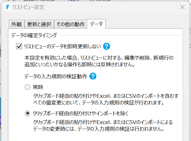 インポートコマンド実行時の検証をスキップして、インポートデータをリストビューに設定します。リストビュー設定の[データの確定タイミング]を[クリップボード経由の貼り付けやインポートを除く]に設定します。