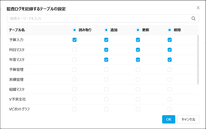 [対象テーブル]の[監査ログを記録するテーブル設定]をクリックして、監査ログを設定したいテーブル毎に[読み取り]、[追加]、[更新]、および[削除]のチェックボックスをチェックします。なお、[ストアドプロシージャーの呼び出し]コマンド、および[SQLクエリーの実行]コマンドで行われたテーブルに対する操作は、本設定を有効にしても記録されません。